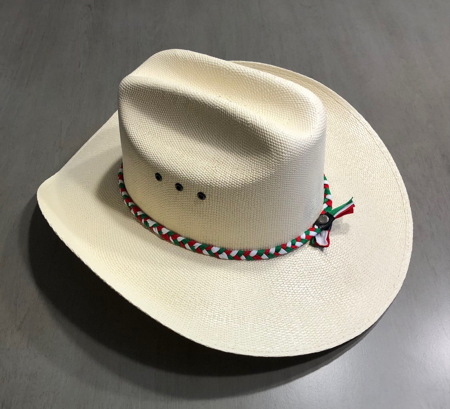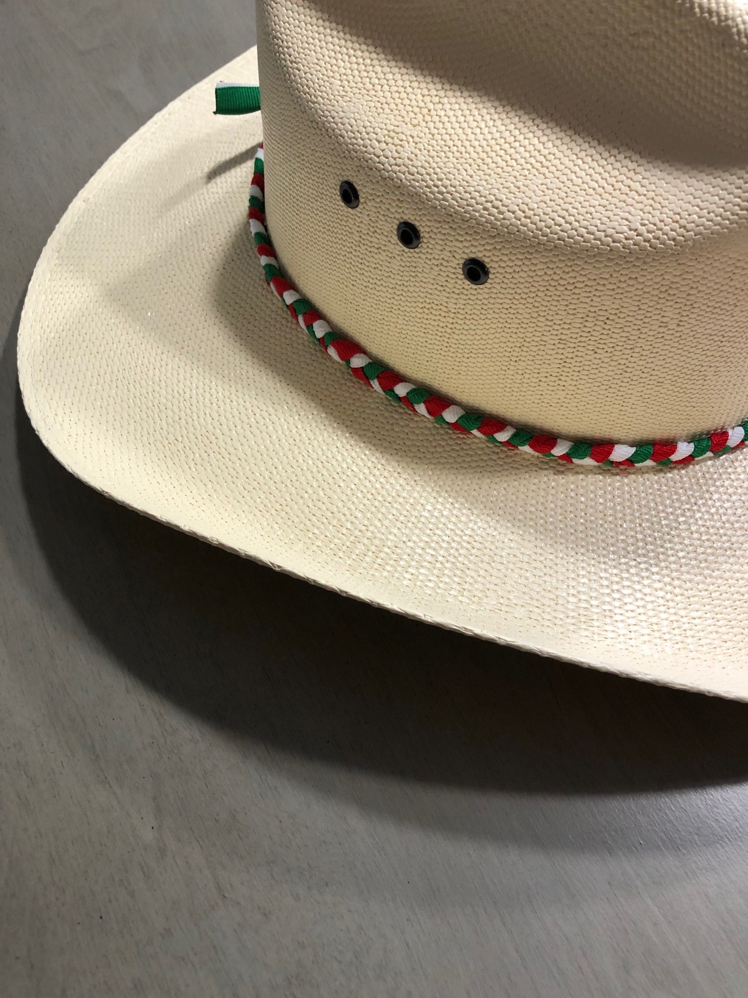 Order of Quetzalcoatl Braided Hat Band; Hand braided hatband in Red, White and Green grosgrain ribbon; Black imitation leather trim with button snap at the back; Stretches to fit most hat sizes; Can be used on Cowboy hats, Derby’s, Fedora’s or any hat for that matter. You can wear it as a necklace if you wish!